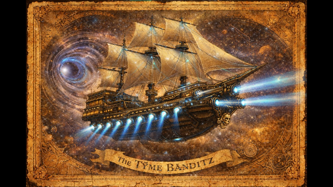 A crew of interstellar pirates sailed a starship modeled after a 16th-century pirate galleon. Known across the galaxy as The Khronos Nostos, it's powered by solar sails, equipped with quantum rigging, and has cannons tuned to temporal distortion. Their mission was simple: Roam the galaxies, collect lost debris of civilizations, and sell it to the highest bidder. The goal was money. Always money.